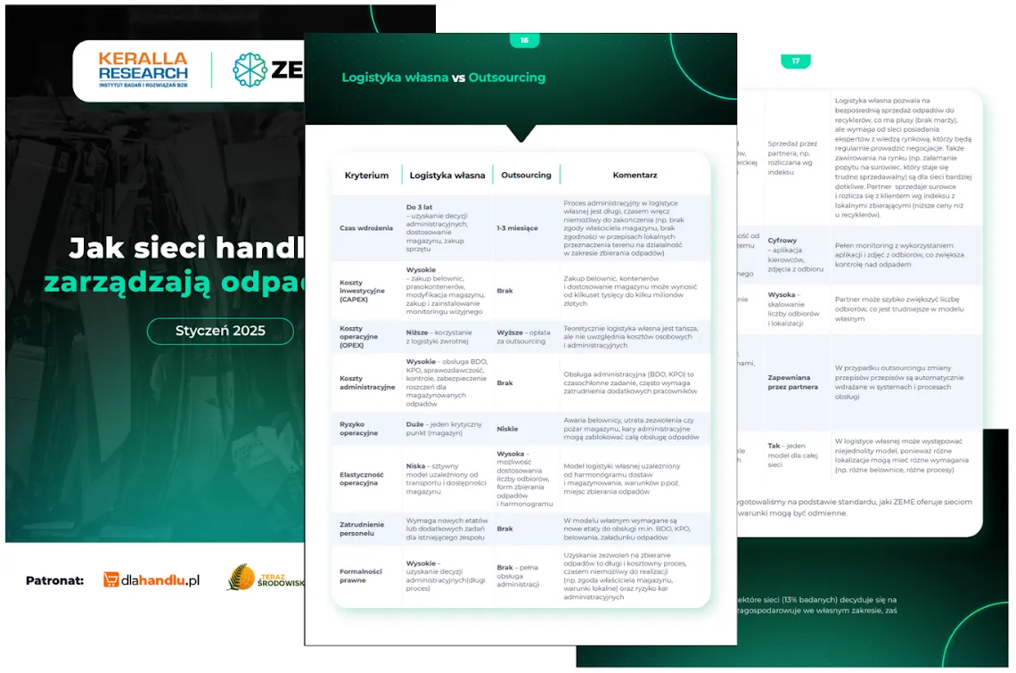 Wspólnie z agencją badawczą Keralla Research, przebadaliśmy ponad 100 sieci handlowych food i non-food w kontekście zarządzania odpadami. Dylemat logistyki własnej i outsourcingu jest jednym z tematów, który omawiamy w obszernym, darmowym raporcie.