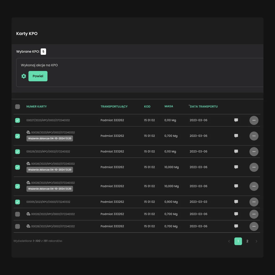Automatyzuj ewidencję KEO. Masowo zarządzaj kartami KPO. Korzystaj z automatycznej korekcji danych, kontroli wag i wiele więcej.