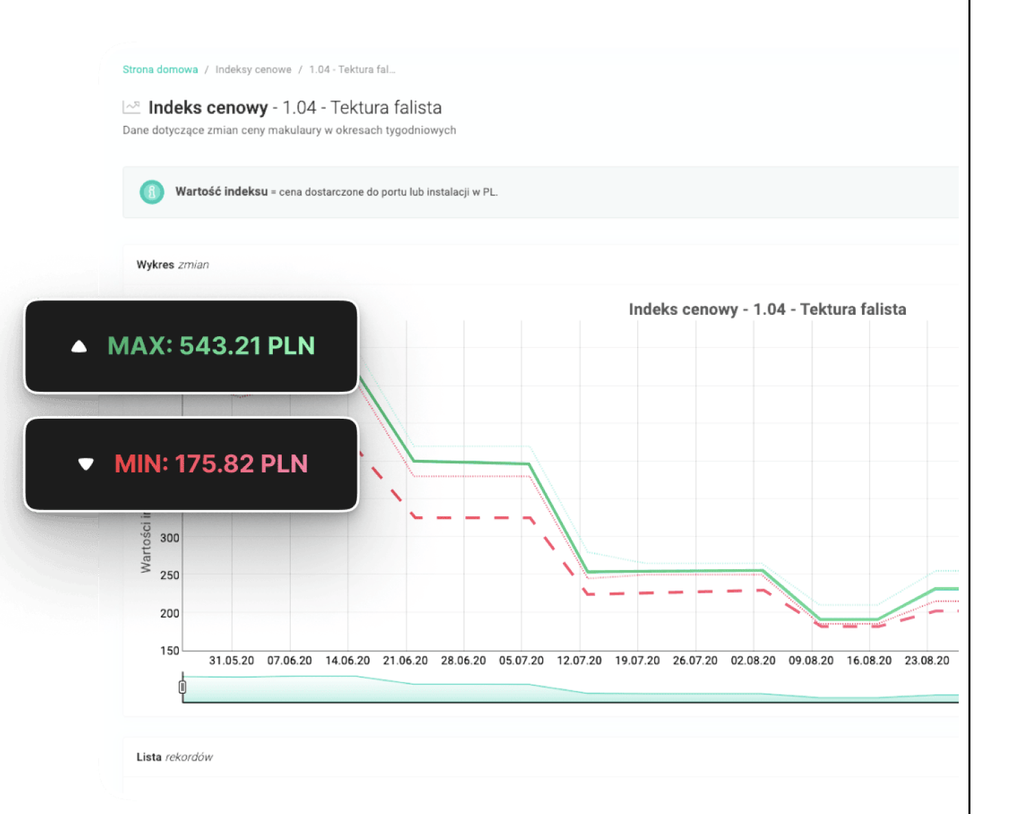 Obecnie na platformie dostępne są indeksy cen trzech najpopularniejszych rodzajów makulatury: tektury falistej (1.04), Druków różnych (3.10) oraz tektury białej wielowarstwowej (3.11/3.12). W najbliższym czasie planujemy poszerzenie naszego modułu indeksów o ceny tworzyw sztucznych (folii).